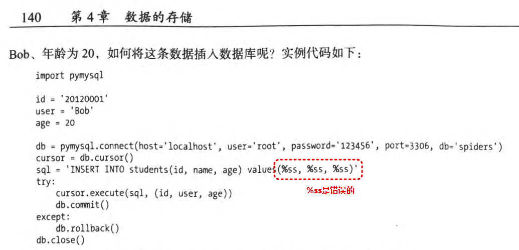 1、原书中的%ss是错误的,在代码测试中输入%ss虽然没有报错,但是数据库始终无法写入数据;