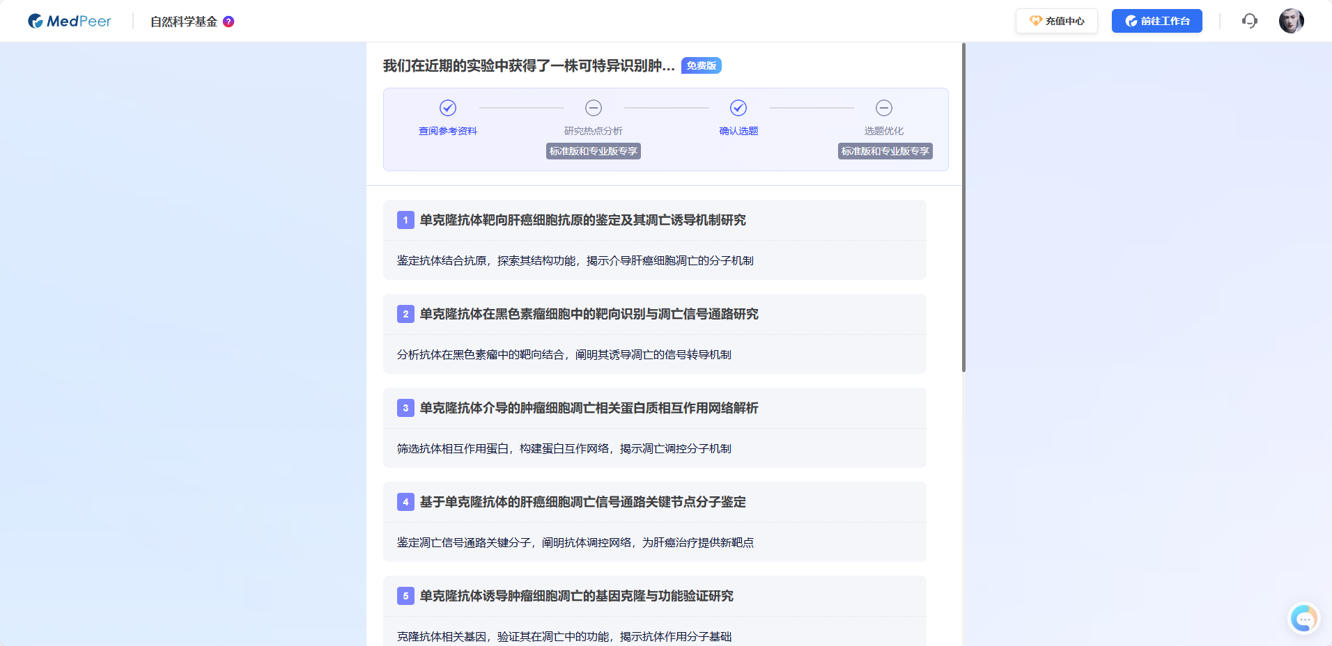 MedPeer的国自然AI项目选题模块,堪称科研人员的"选题外脑"。它并非机械地拼凑关键词,而是基于对海量项目和文献数据的深度学习,模拟专家思维,进行趋势研判与可行性评估。