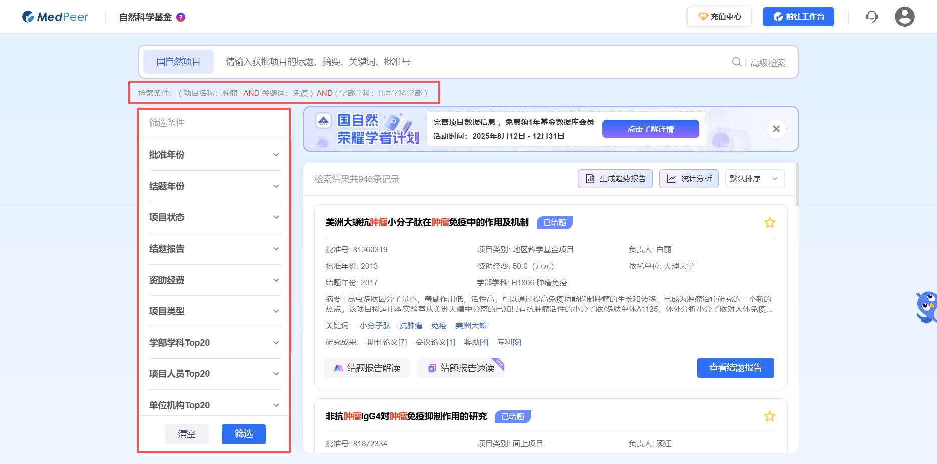 MedPeer基金数据库的价值,在于它将1986年国自然启动以来的八大学部75万余条获批项目 与635万余条关联成果整合为一个动态的、可分析的"科研全息地图"。