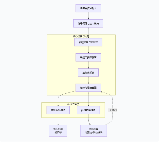 下面的流程图概括了数据在典型飞控系统中的核心处理与传输路径,展示了从信号输入到指令输出的全过程: