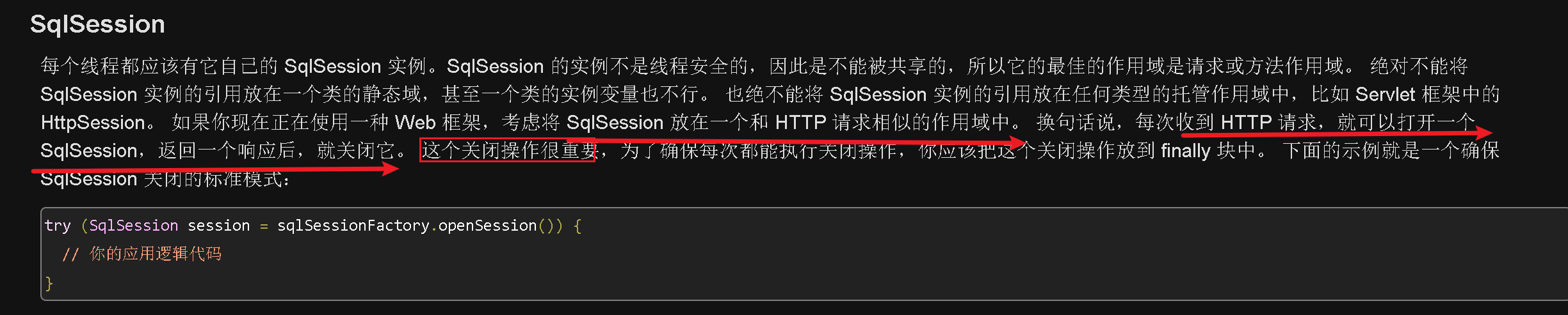 - SqlSession 的实例不是线程安全的,因此是不能被共享的,所以它的最佳的作用域是请求或方法作用域。