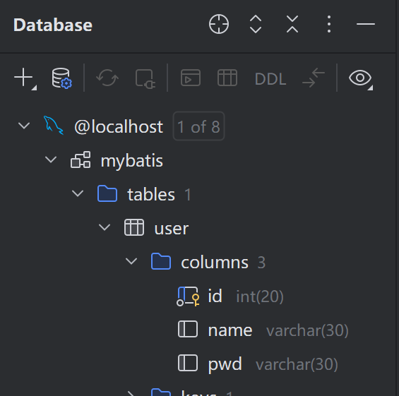 select id,name,pwd as password from mybatis.user where id=#{id};