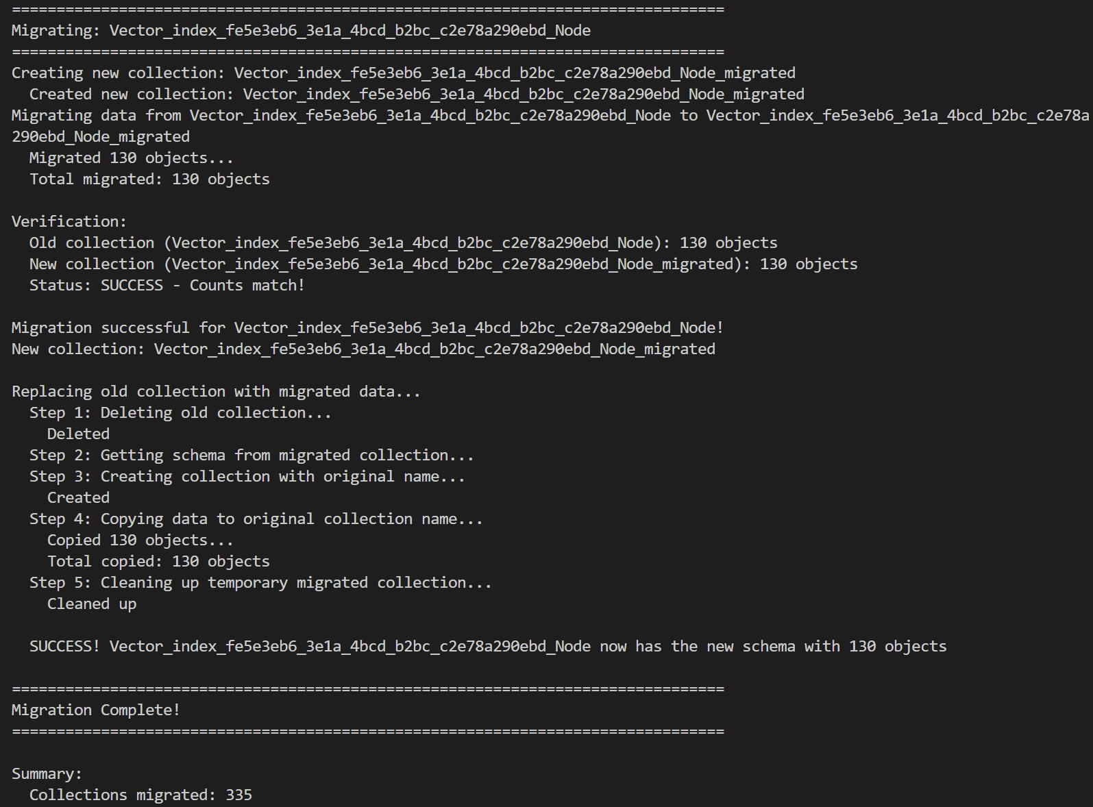 日志的最后一行显示整个迁移过程已完成,共迁移了 335 个集合。整个过程包括创建新集合、迁移数据、验证、替换旧集合以及清理临时集合,所有步骤均成功执行。