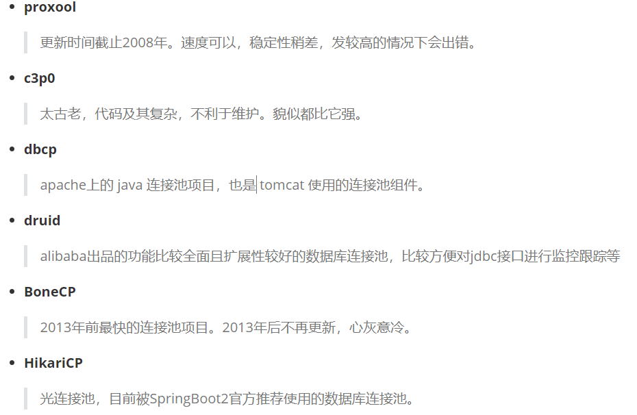 1:性能方面 HikariCP>Druid>tomcat-jdbc>dbcp>c3p0 。hikariCP的高性能得益于最大限度的避免锁竞争。