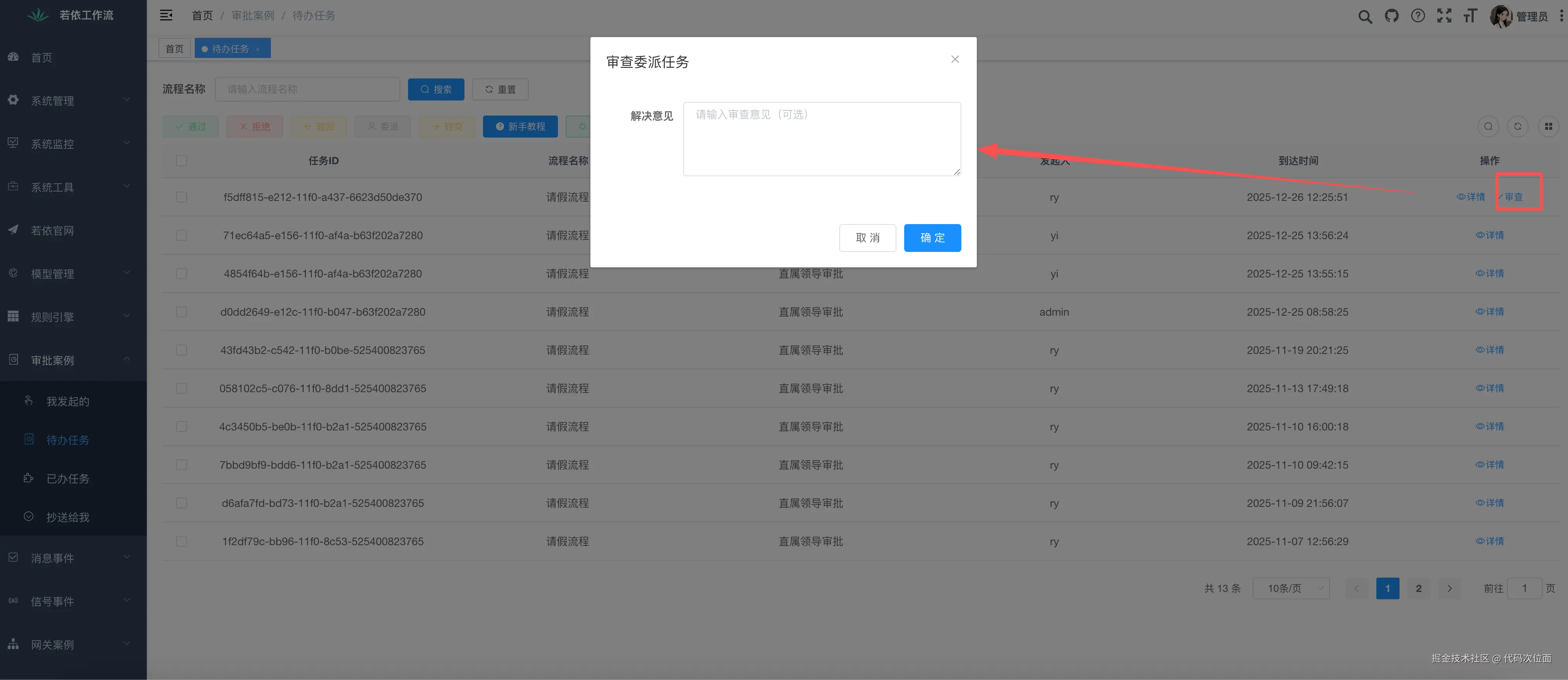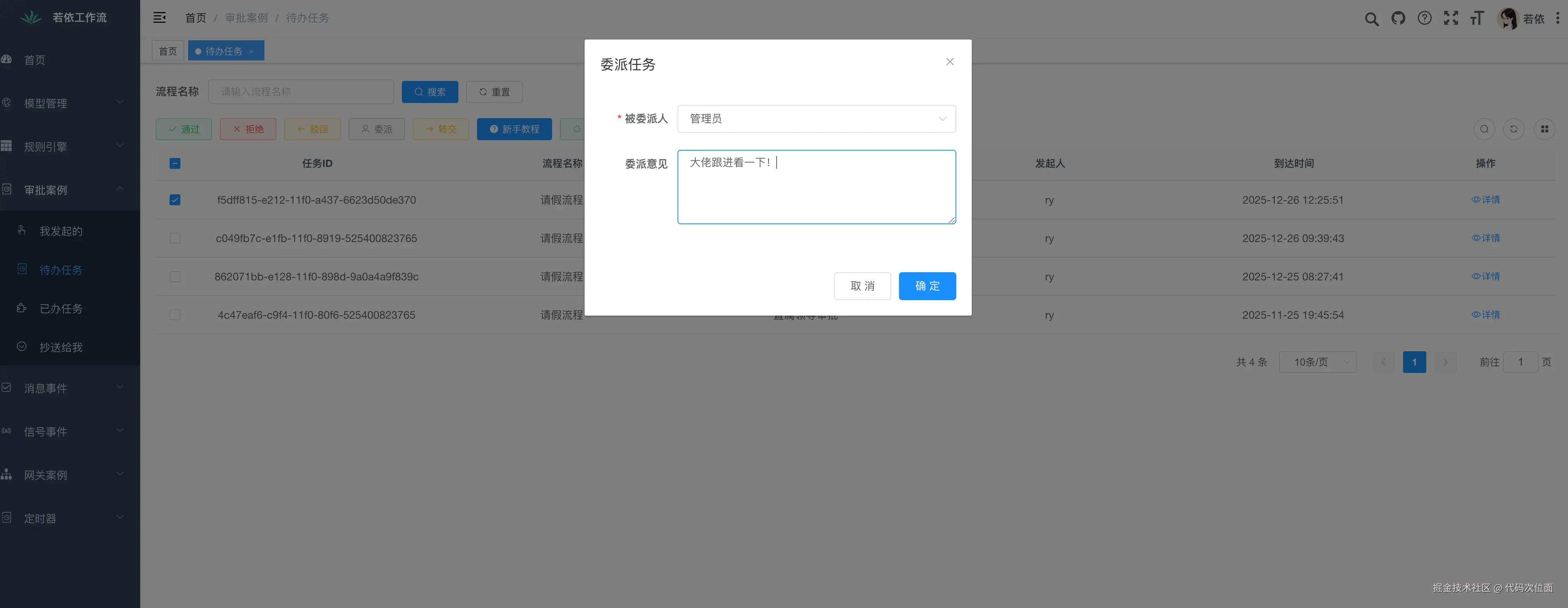使用若依(ry)账号登陆系统,在待办任务,通过委派操作,将任务先转交给admin