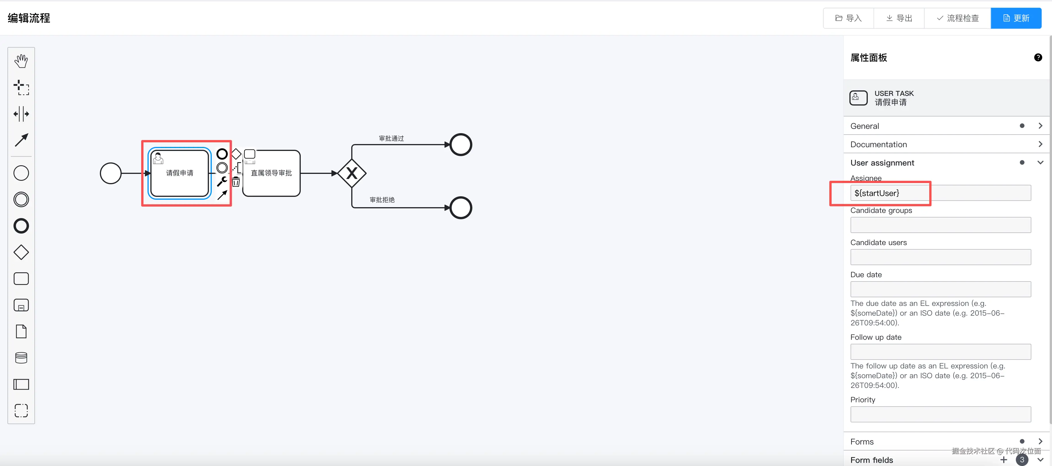 <bpmn:userTask id="Activity_0qetwmj" name="直属领导审批" camunda:assignee="${candidate}">