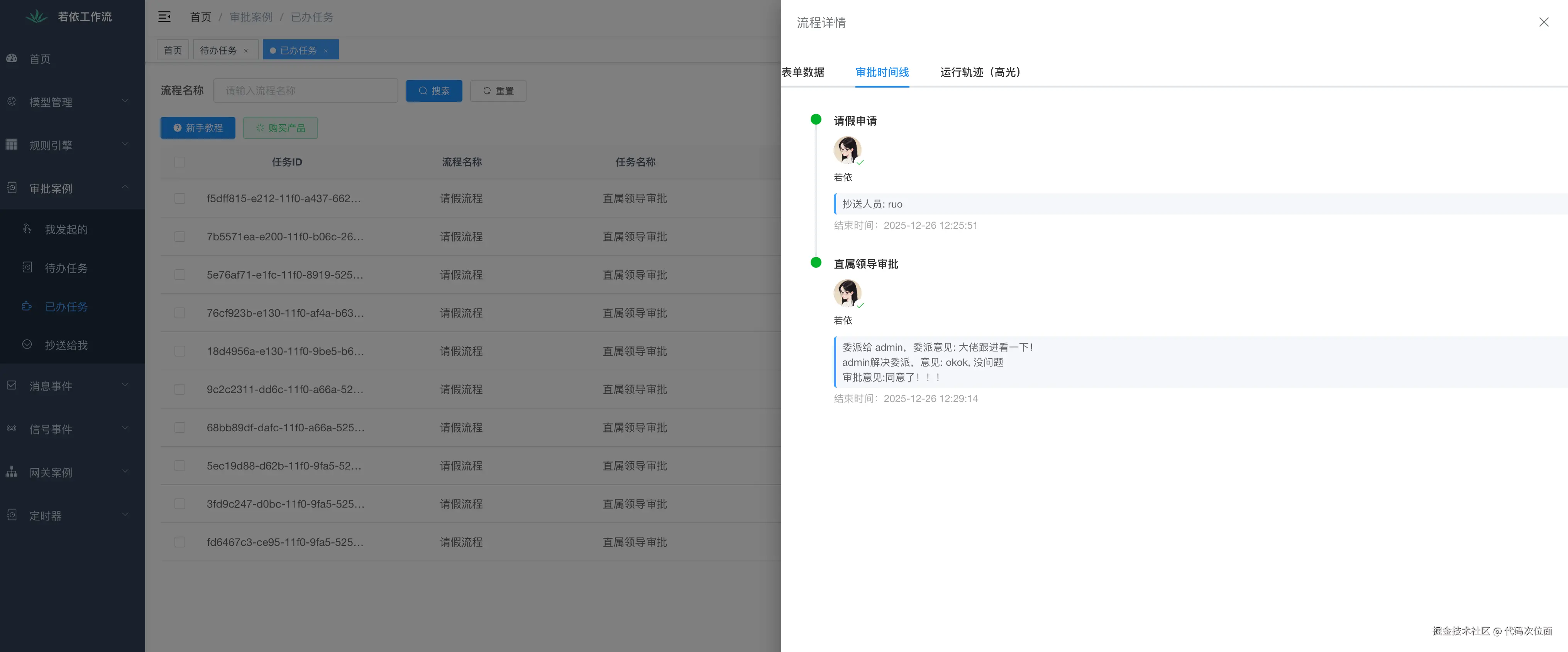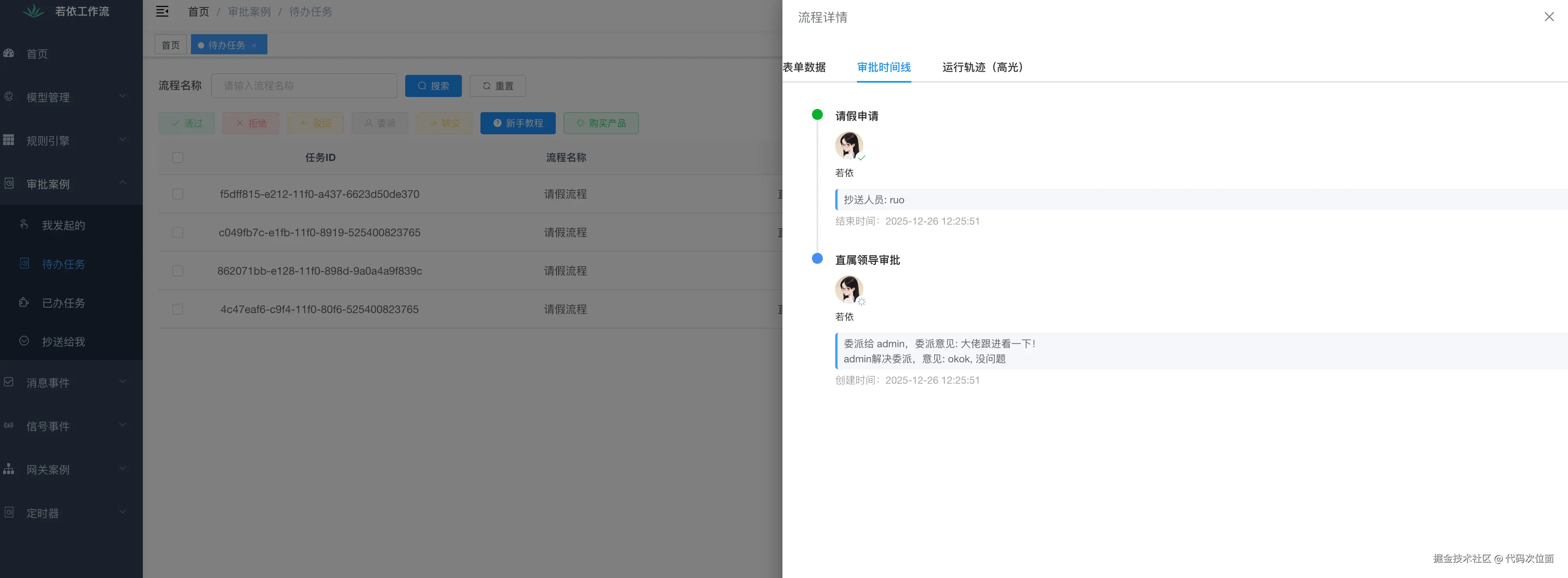 使用若依(ry)账号登陆系统,在待办任务中,执行通过,拒绝等操作, 时间线看到了最终效果。