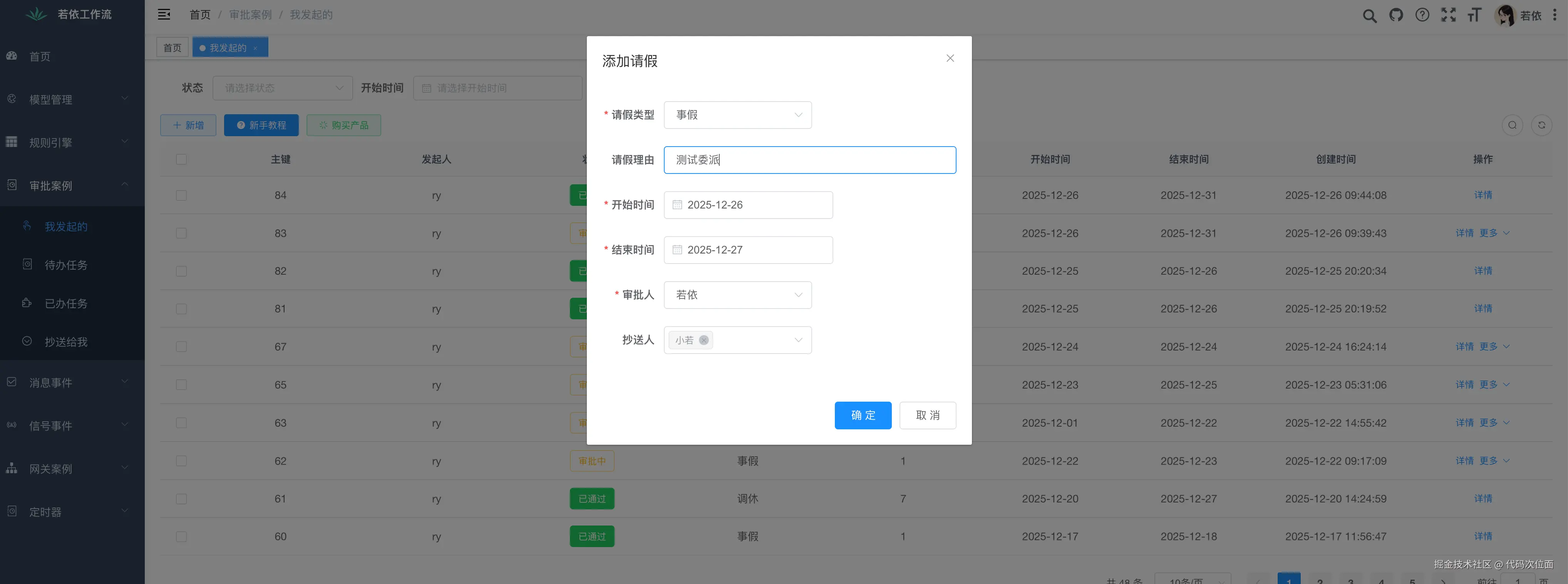 使用若依(ry)账号登陆系统,发起一个请假申请, 备注,测试委派, 注意,我同样选择了ry这个账户做审批人