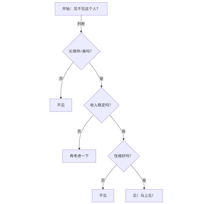 假设你的七大姑八大姨给你介绍对象,你肯定心里有一杆秤(虽然嘴上说"看感觉")。这杆秤其实就是一棵决策树。