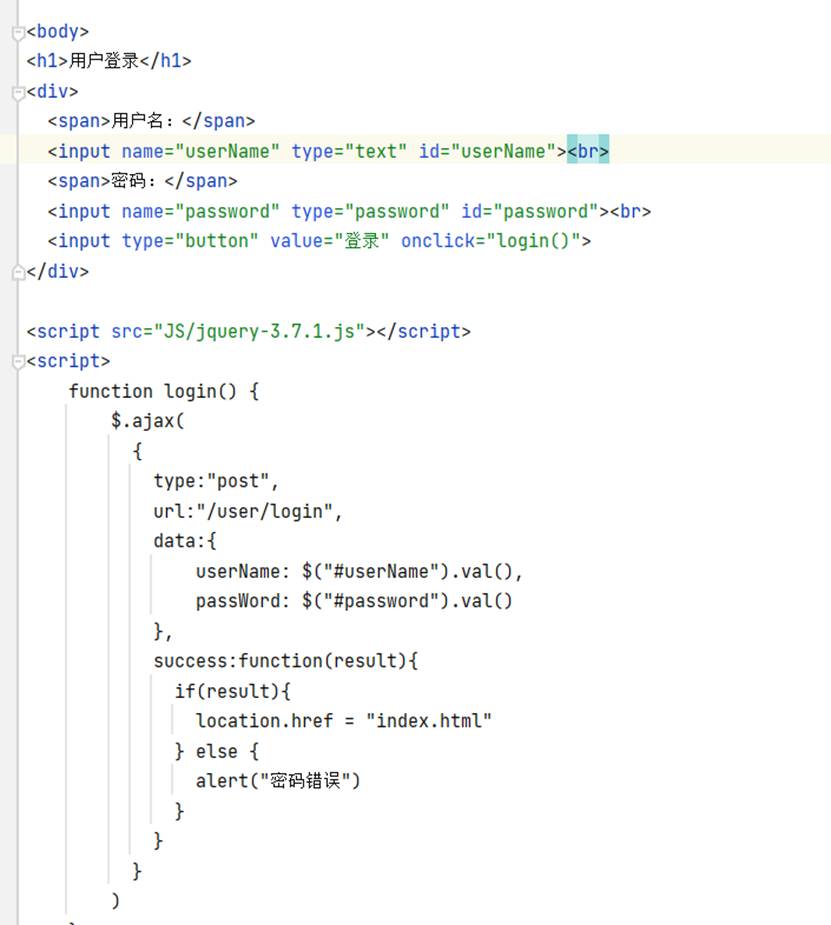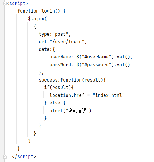 这个页面也是涉及到ajax异步编程,一样的需要表名这个里面有啥,type传输方式,url传输的路径,success接收到后端参数之后需要进行的事情