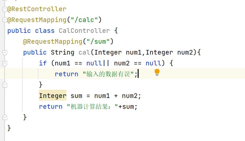 首先写注解@RestController,表示之后返回的是数据,然后使用@RequestMapping标志映射的地址,判断的逻辑就很简单了,进行简单的加法,然后就放回即可