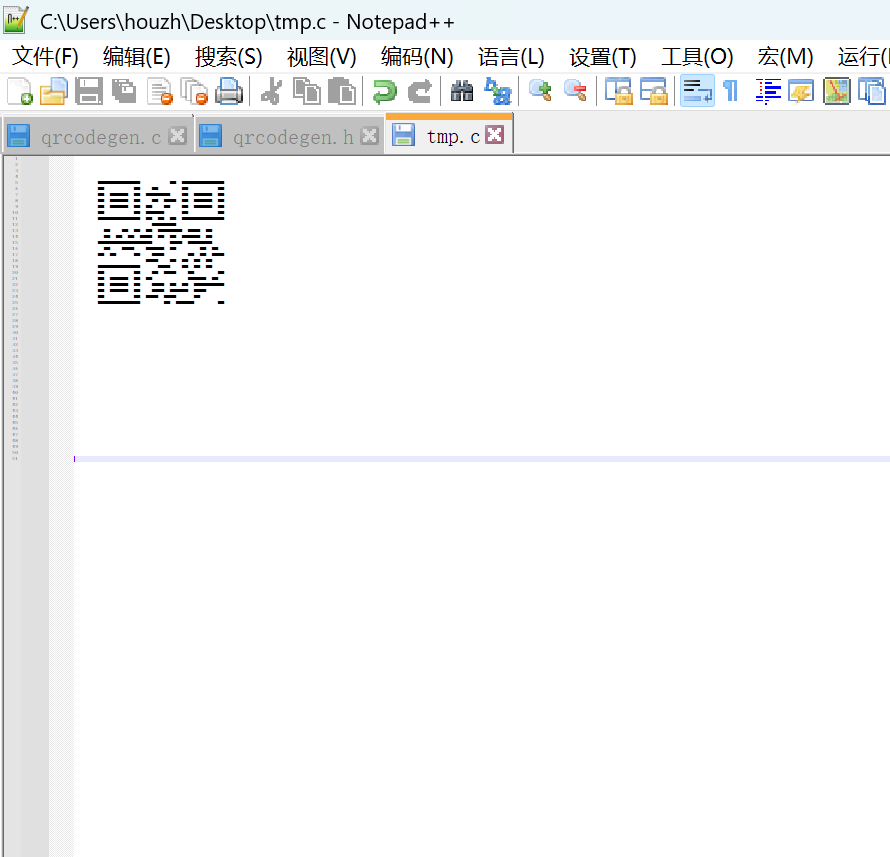 调用库的核心函数qrcodegen_encodeText:将文本编码成QR码。