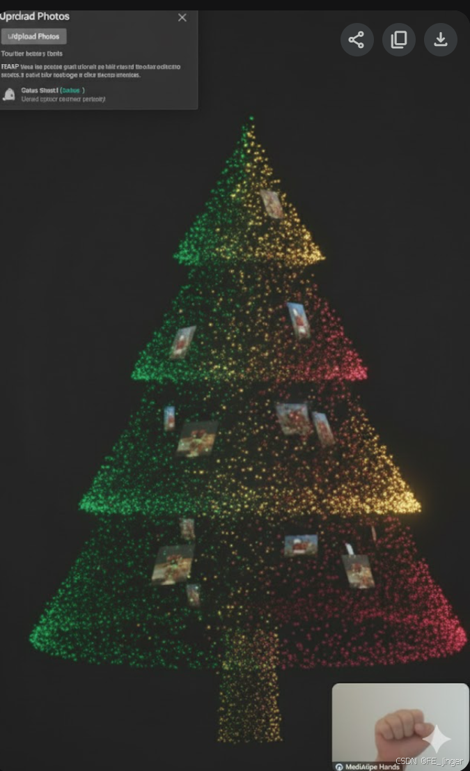 在节日氛围浓厚的场景下,交互式粒子效果的圣诞树成为前端创意开发的热门方向。本文将从需求分析、技术栈选型到完整代码实现,手把手教你打造一款支持自定义图片/压缩包上传 、手势控制状态切换 、多端适配的圣诞树粒子效果网页,兼顾PC端和移动端体验。