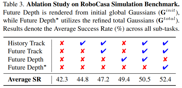 - 深度渲染监督 :通过可微分阿尔法合成从 3D 高斯模型渲染未来深度图,采用掩码 L1 损失( L d e p t h L_{depth} Ldepth)监督几何精度,仅关注工作空间内的有效区域。