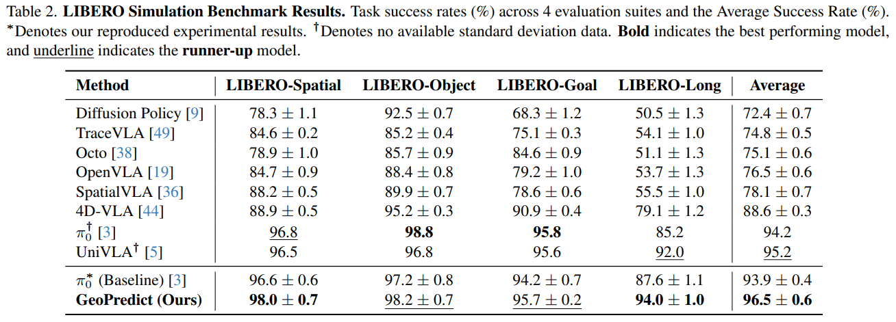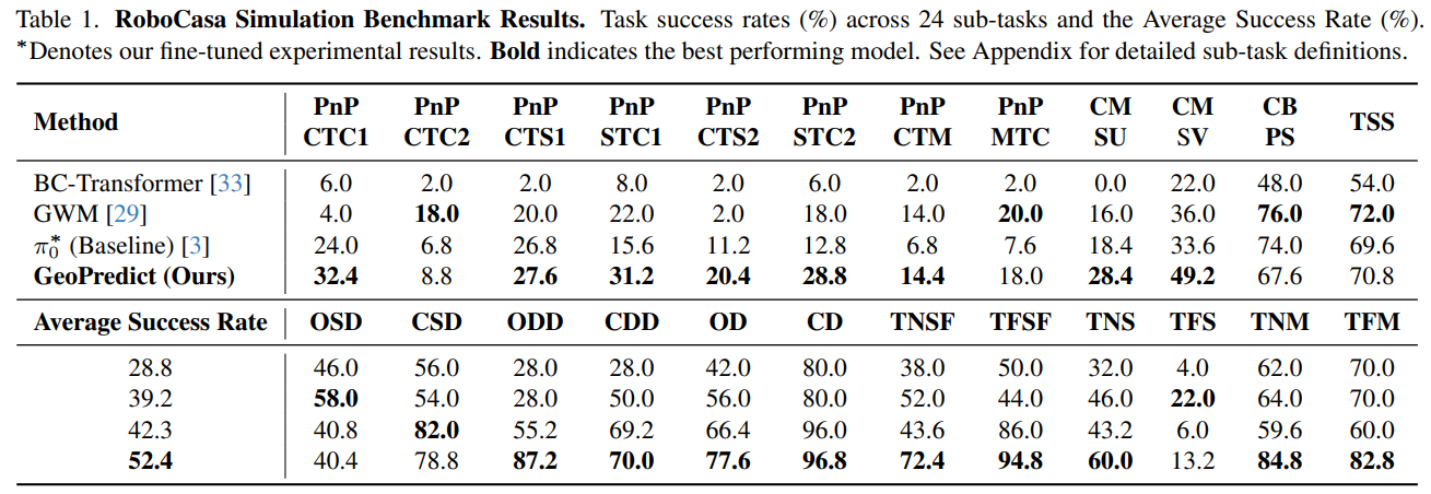 在两大权威机器人操纵基准上,GeoPredict 显著超越现有方法: