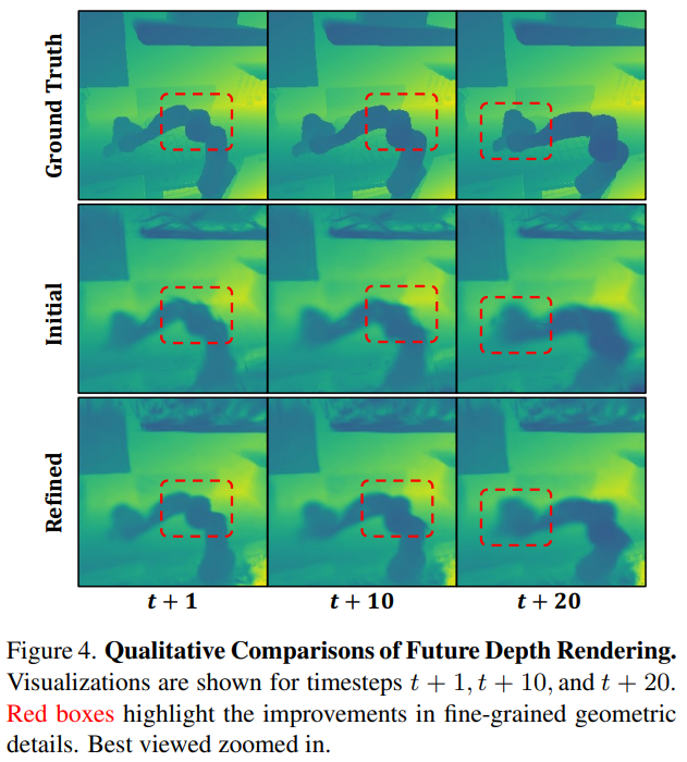 - 随时间步(t+1→t+20)演进,预测深度图与真实场景的一致性持续保持,验证长时程几何预测的稳定性。