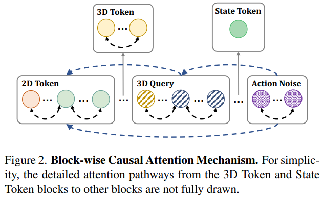 token分组:将文本 / 图像token(2D Token)、历史轨迹token(3D Token)、未来查询token(3D Query)、本体感受token(State Token)、动作噪声token(Action Noise)划分为五个有序块;