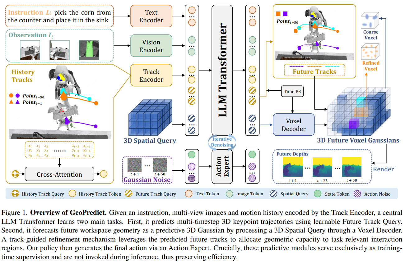 针对上述挑战,GeoPredict 构建了 "运动学预测 - 几何建模 - 注意力融合" 的三层技术体系,在不增加推理负担的前提下,为 VLA 模型注入未来感知的几何先验: