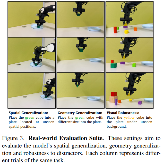 - 空间泛化任务:将绿色立方体放入未见过的目标位置,成功率达 85.0%(基线 60.0%);