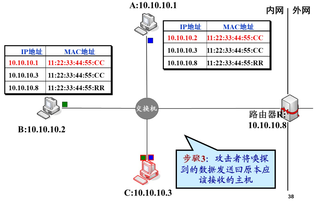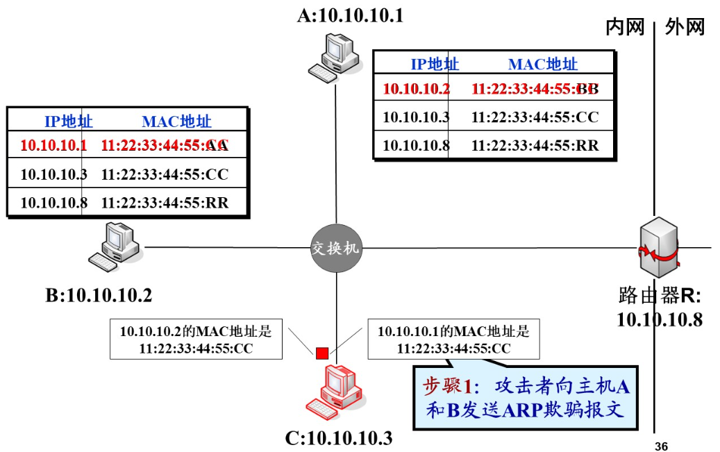 ARP欺骗:利用ARP协议漏洞,发送欺骗报文,修改目标主机的ARP表,使得目标主机给其他主机的报文发送到自己这里(重定向)
