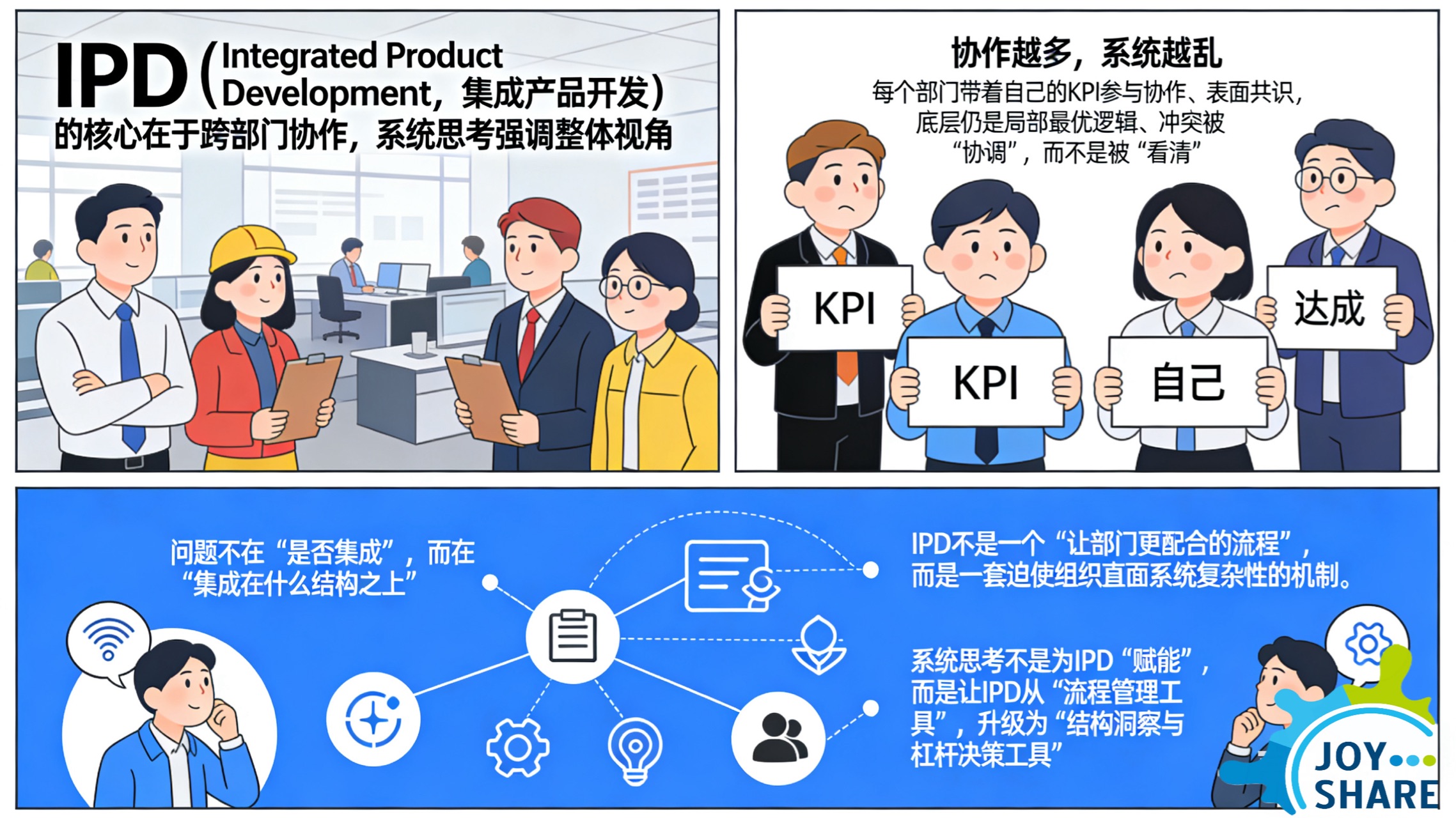 但现实中,绝大多数IPD并不是没有协作,而是"协作越多,系统越乱"。什么原因?因为在没有系统思考的情况下,跨部门协作通常会变成:每个部门带着自己的KPI参与协作、表面共识,底层仍是局部最优逻辑、冲突被"协调",而不是被"看清",结果是:协作并没有消除系统问题,只是把系统问题推迟到更晚、更贵的阶段爆发。