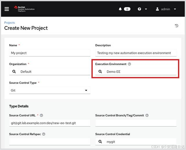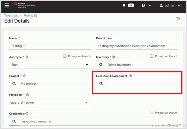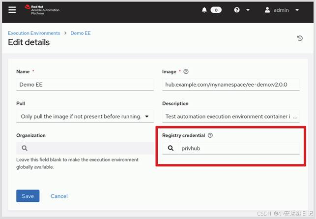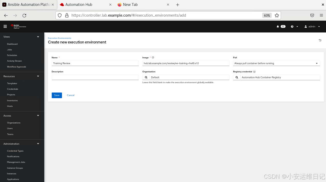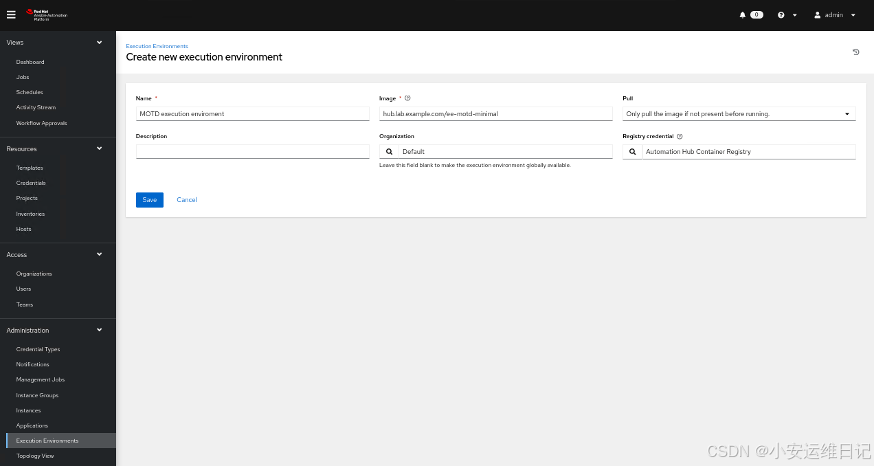 7. 使用自动化控制器web UI创建一个执行环境资源,参考下表设置(如表所示)
