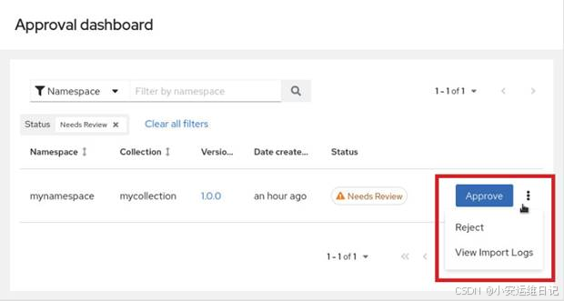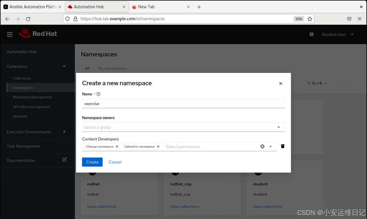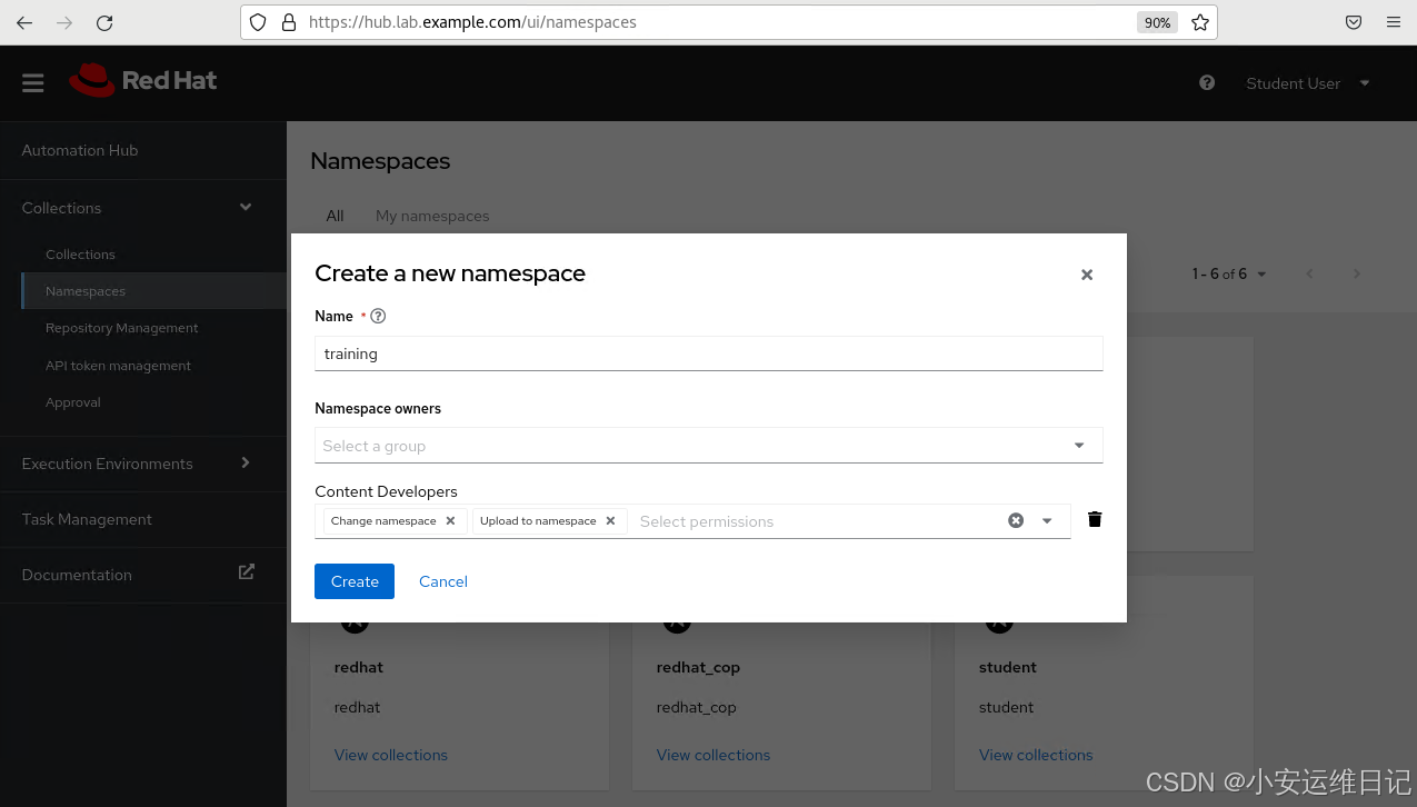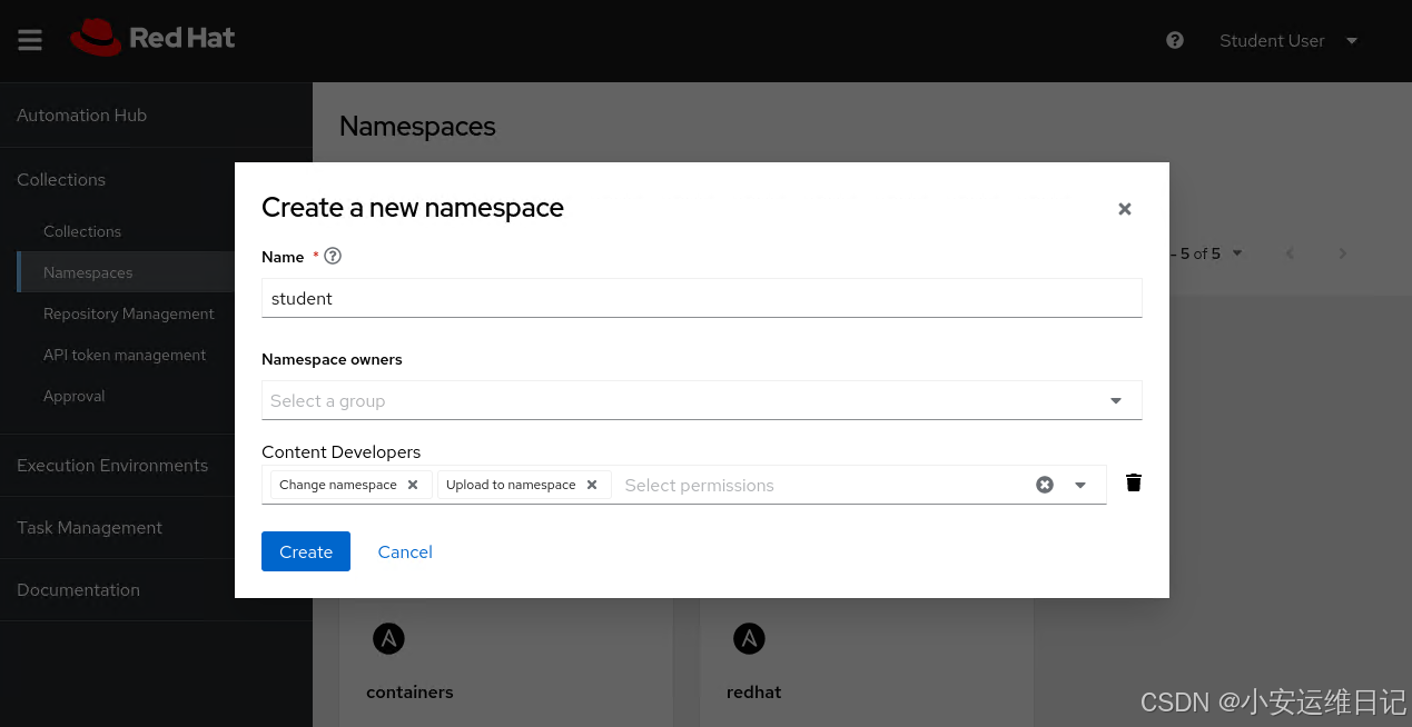 如果你将集合发布到私有自动化中心 ,那么就请平台管理员为你创建一个命名空间。或者,如果你的用户账号有权限的话,也可以自己创建命名空间