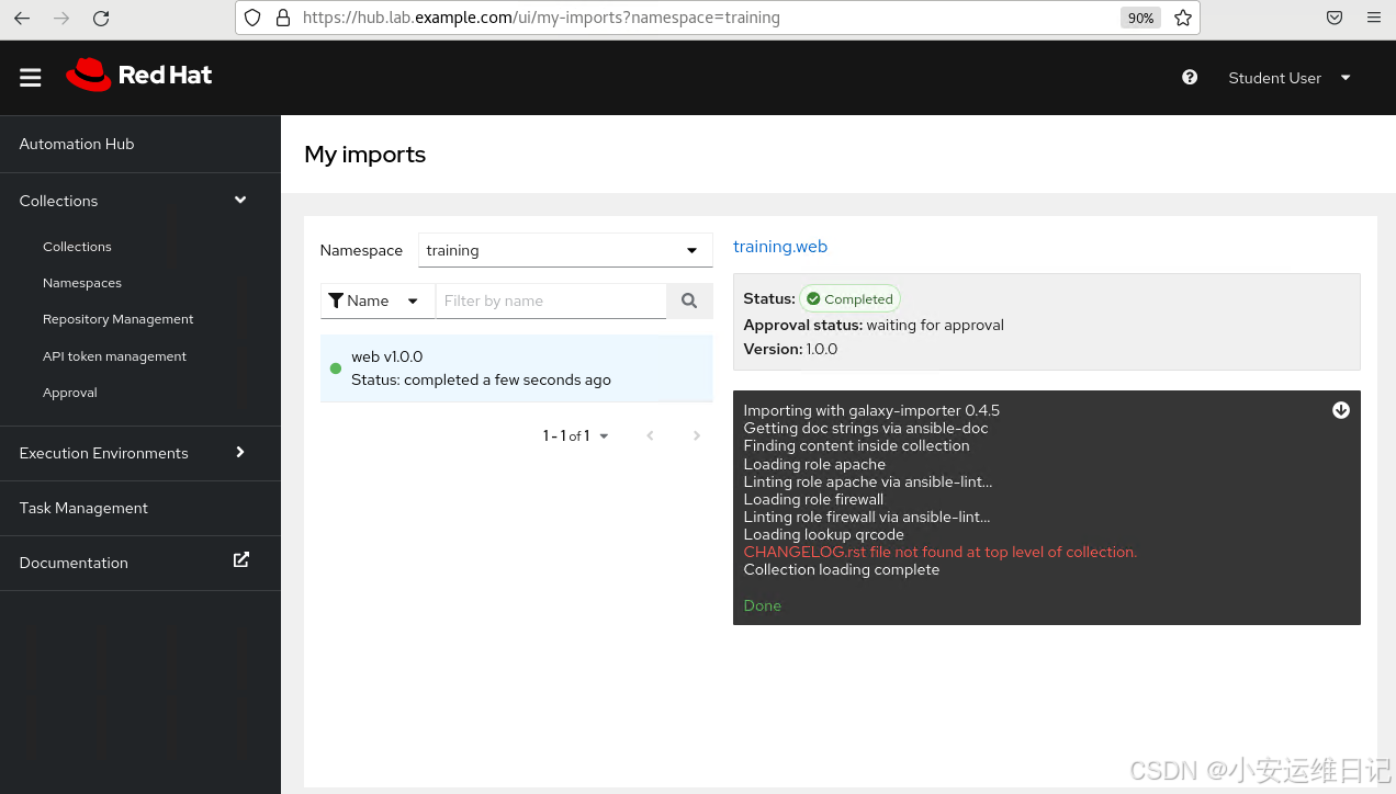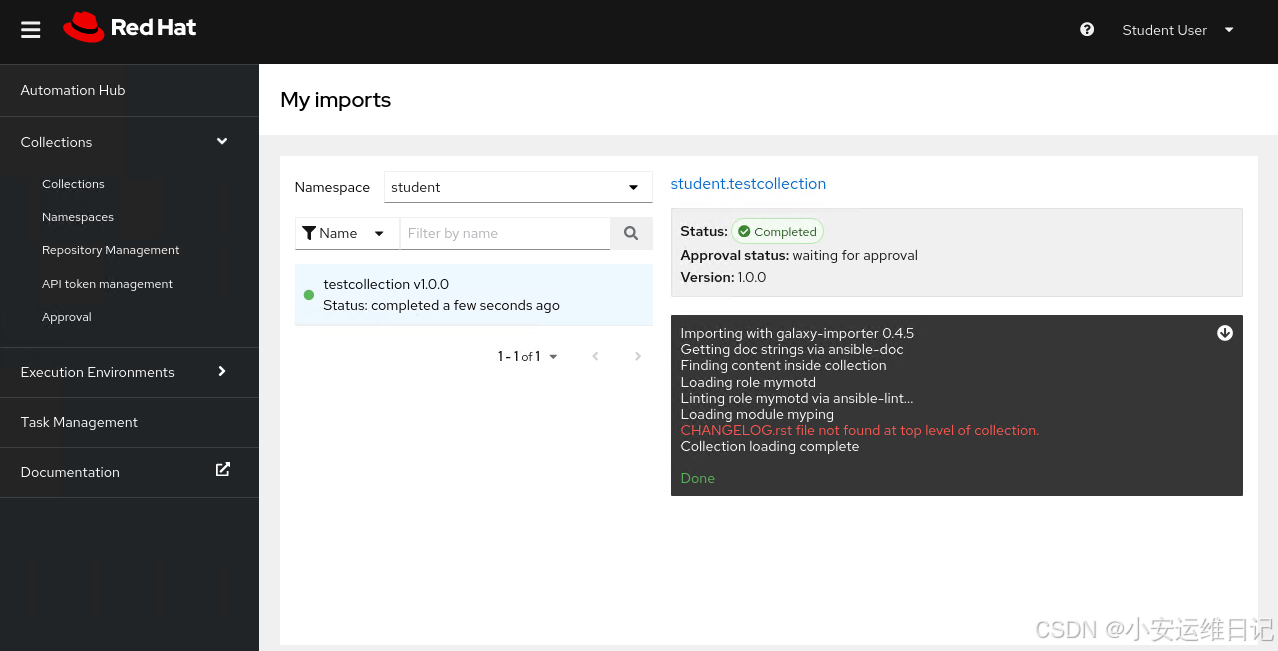 当你将集合发布到Ansible Galaxy、Automation Hub或私有自动化中心时,平台会自动运行一些测试。例如,私有自动化中心使用ansible-lint工具来验证你的集合是否符合Ansible团队制定的标准和最佳实践,平台会将生成的报告与集合一起发布。以下输出结果显示了mynamespace.mycollection集合的导入日志。