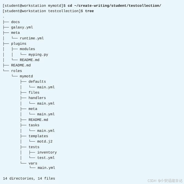 因为ansible-galaxy collection init命令并不创建meta/目录,所以如果需要的话,你必须自行创建meta/ 目录以及runtime.yml文件。