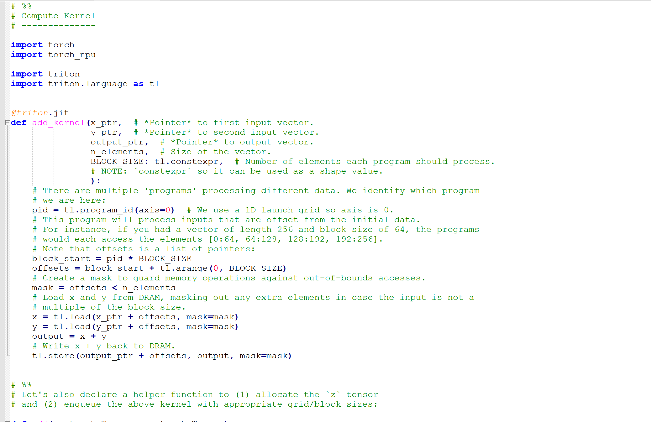 | Python# 加载数据x = tl.load(x_ptr + offsets, mask=mask)y = tl.load(y_ptr + offsets, mask=mask)# 计算output = x + y# 回写数据tl.store(output_ptr + offsets, output, mask=mask) |