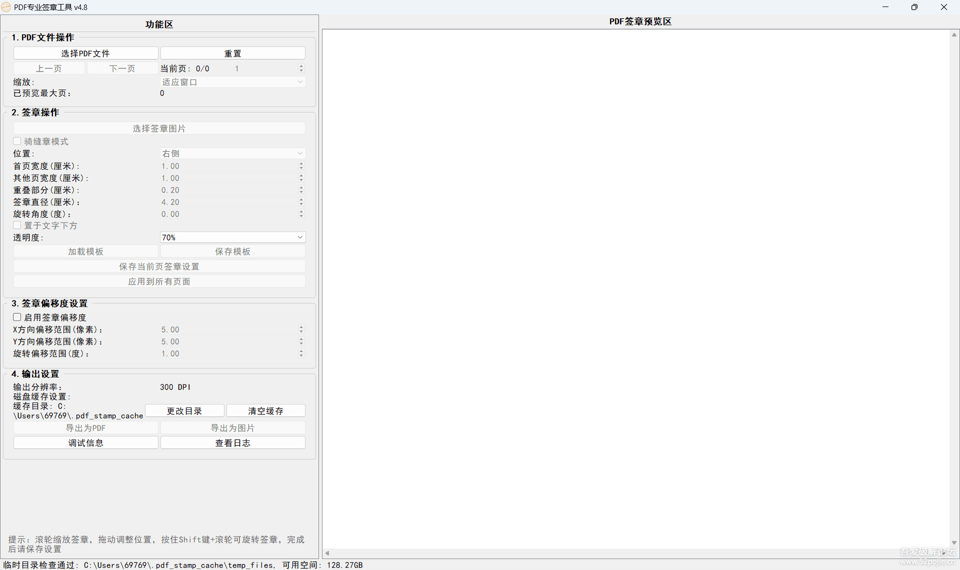 Windows\] PDF 专业电子签章工具 v4.8 链接:[https://pan.xunlei.com/s/VOhK7G7GLGde9lJ53oUOne0GA1?pwd=75fj#](https://pan.xunlei.com/s/VOhK7G7GLGde9lJ53oUOne0GA1?pwd=75fj# "https://pan.xunlei.com/s/VOhK7G7GLGde9lJ53oUOne0GA1?pwd=75fj#")  **本工具适合需要给PDF文件添加签章或骑缝章的用户,特别是需要高质量输出的专业场景** **主要功能特点** **1. PDF文件处理** * 支持加载和预览PDF文件 * 显示总页数和当前页码 * 支持页面导航(上一页/下一页/跳转到指定页) * 支持缩放控制(适应窗口、50%-400%多级缩放) **2. 签章功能** * 普通签章模式:在PDF页面上添加自定义签章 * 骑缝章模式:将签章分割应用到多页PDF边缘 * 支持右侧、左侧、顶部、底部四种位置 * 可设置首页宽度和其他页宽度 * 可调整重叠部分大小 * 支持签章位置拖动调整 * 支持鼠标滚轮缩放签章 * 支持Shift+滚轮旋转签章 **3. 签章参数设置** * 签章直径:可调整签章大小(厘米) * 旋转角度:0-360度精确旋转 * 透明度设置:10%-100%多级透明度 * 图层位置: * 置于文字上方(支持透明度) * 置于文字下方(强制100%不透明) * 注:扫描图像PDF不支持置于文字下方 **4. 模板功能** * 保存模板:将当前页签章设置保存为JSON模板文件 * 加载模板:从模板文件恢复签章设置 * 模板包含完整的位置、缩放、旋转、透明度等信息 **5. 批量操作** * 应用到所有页面:将当前页签章设置应用到所有页面 * 签章偏移度设置:为多页PDF应用随机偏移,避免签章位置完全一致 * 可设置X/Y方向偏移范围 * 可设置旋转偏移范围 **6. 输出功能** * 导出为PDF:生成带签章的PDF文件 * 导出为图片:生成JPG格式图片文件(每页一张) * 固定输出分辨率:300 DPI高质量输出 **7. 磁盘缓存管理** * 智能缓存系统:使用磁盘缓存处理大型文件 * 缓存目录管理: * 可更改缓存目录位置 * 禁止设置为桌面目录(安全保护) * 可清空缓存 * 磁盘空间检查:导出前自动检查可用空间 **8. 高级特性** * 自动类型检测:自动识别矢量PDF和扫描图像PDF * 优化内存使用:流式处理大文件,避免内存不足 * 支持矢量PDF直接嵌入:对矢量PDF使用更高效的处理方式 * 错误处理:完善的错误提示和恢复机制 **操作流程** **基本操作步骤:** * 选择PDF文件 → 点击"选择PDF文件"按钮 * 选择签章图片 → 点击"选择签章图片"按钮(支持PNG/JPG/JPEG/BMP格式) * 调整签章: * 拖动:调整位置 * 滚轮:缩放大小 * Shift+滚轮:旋转 * 参数设置:调整直径、透明度、旋转角度等 * 保存设置 → 点击"保存当前页签章设置" * 应用到其他页 → 点击"应用到所有页面"(可选) * 导出文件 → 点击"导出为PDF"或"导出为图片" **骑缝章模式操作:** * 勾选"骑缝章模式" * 选择骑缝章图片 * 设置位置(右侧/左侧/顶部/底部) * 调整首页宽度和其他页宽度 * 设置重叠部分大小 * 拖动整体调整位置(所有页同步移动) **模板操作:** * 保存模板:调整好签章后点击"保存模板" * 加载模板:点击"加载模板"选择之前保存的模板文件 **缓存管理:** * 更改缓存目录:点击"更改目录"选择新的缓存位置 * 清空缓存:点击"清空缓存"释放磁盘空间 **界面布局** **左侧功能区(1/3宽度):** * PDF文件操作区 - 文件选择和页面导航 * 签章操作区 - 签章选择和参数设置 * 签章偏移度设置区 - 批量应用的随机偏移 * 输出设置区 - 导出和缓存管理 **右侧预览区(2/3宽度):** * PDF页面和签章实时预览 * 支持缩放和拖动查看 **技术特点** * 多线程处理:导出时使用独立线程,不阻塞界面 * 智能缓存:使用磁盘缓存避免内存溢出 * 错误恢复:完善的异常处理和用户提示 * 资源优化:自动垃圾回收和内存管理 * 兼容性:支持多种图片格式和PDF版本 **注意事项** * **扫描图像PDF限制:扫描图像PDF不支持"置于文字下方"功能** * **磁盘空间:处理大文件时需要足够的磁盘空间用于缓存** * **签章图片:建议使用透明背景的PNG图片以获得最佳效果** * **性能优化:处理超大PDF文件时建议分批操作**
