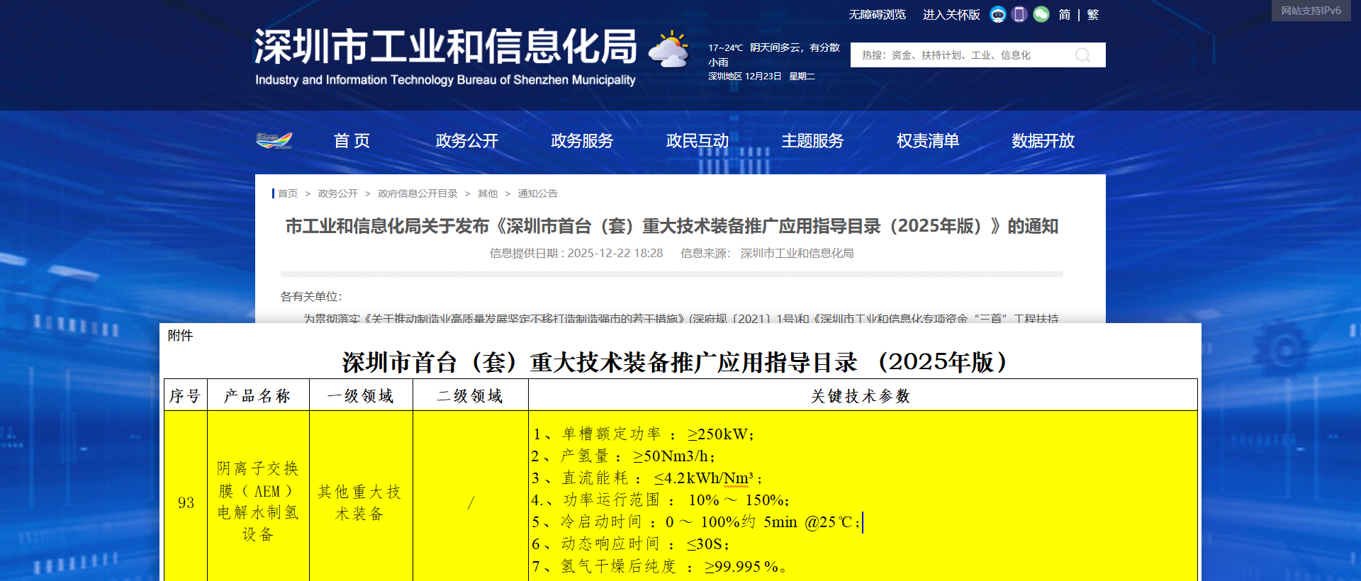 2025年12月22日,深圳市工业和信息化局发布《深圳市首台(套)重大技术装备推广应用指导目录(2025年版)》的通知,稳石氢能250kW AEM制氢设备正式入选,成为该目录中唯一氢能类设备。作为国内AEM制氢领域的大标方标杆产品,该装备的入选不仅标志着其技术先进性与商业化成熟度获得官方认证,更通过首台(套)政策构建的创新生态,为绿氢产业商业化落地按下 "加速键"。