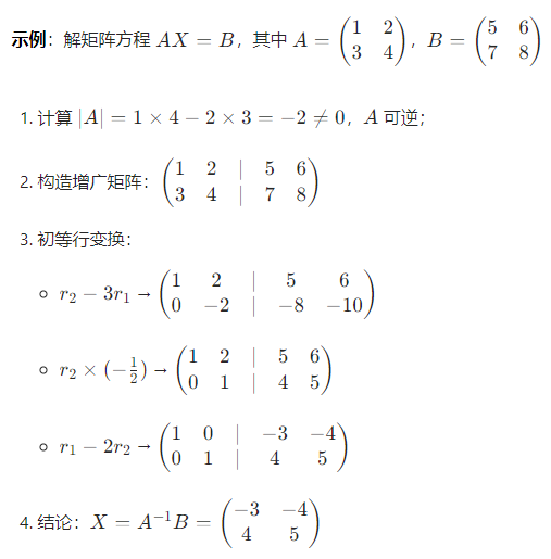 无需单独计算 ,直接构造增广矩阵 [A∣B],对其进行初等行变换 ,当左边 A 化为 E 时,右边 B 同步化为