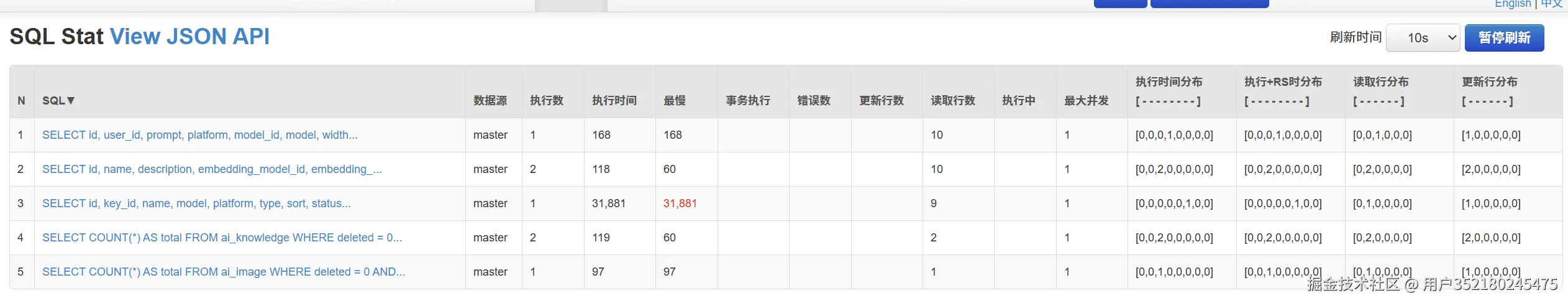 监控页面:访问 /druid/,admin/123456 登录,就能看到 master/slave 切换、SQL 统计、慢查询,爽!