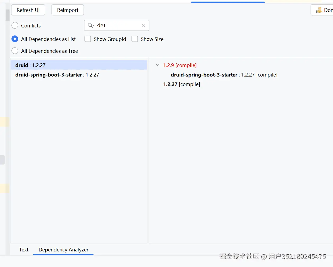 一般只加这一个 Druid starter 就够啦!但是使用的是最新的1.2.27的包,druid-spring-boot-3-starter依赖的是1.2.9,所以需要强制添加核心,是否依赖正确的包,可以通过maven help来排查冲突: