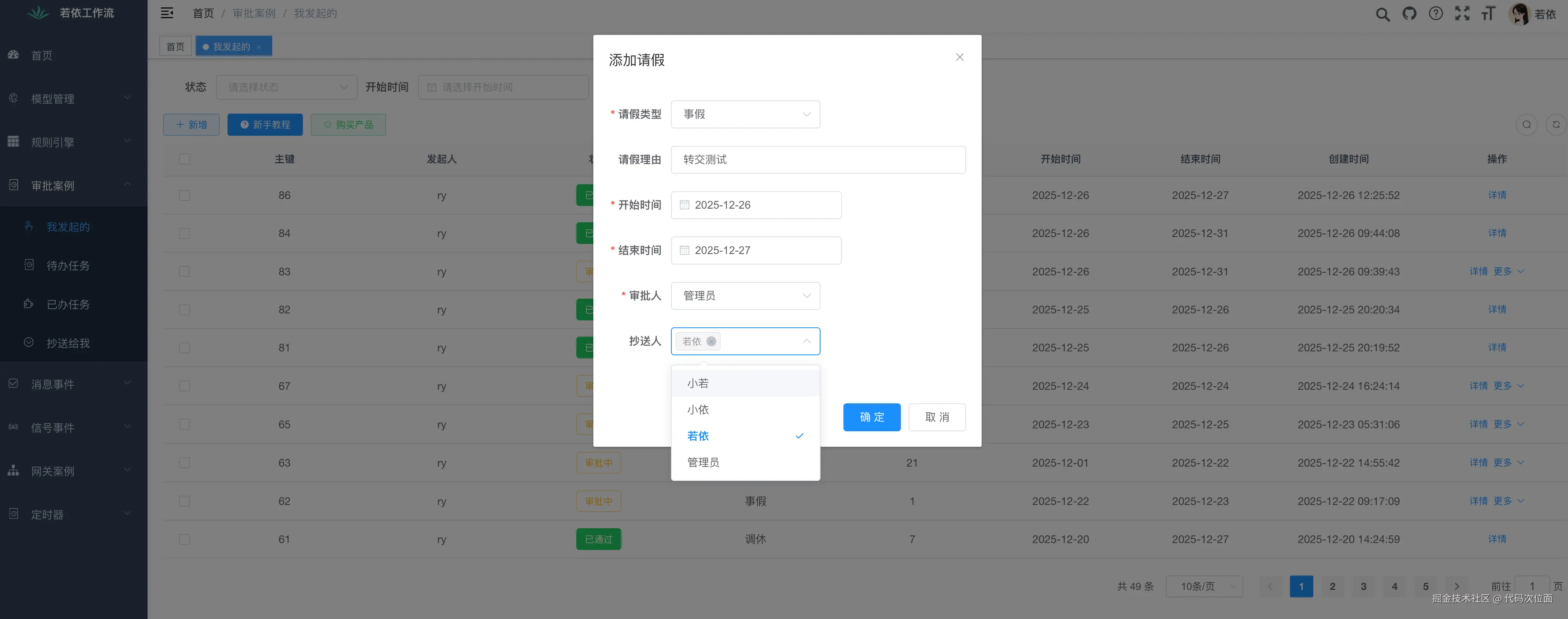 使用若依(ry)账号登陆系统,发起一个请假申请, 备注,测试转交, 并将管理员作为审批人