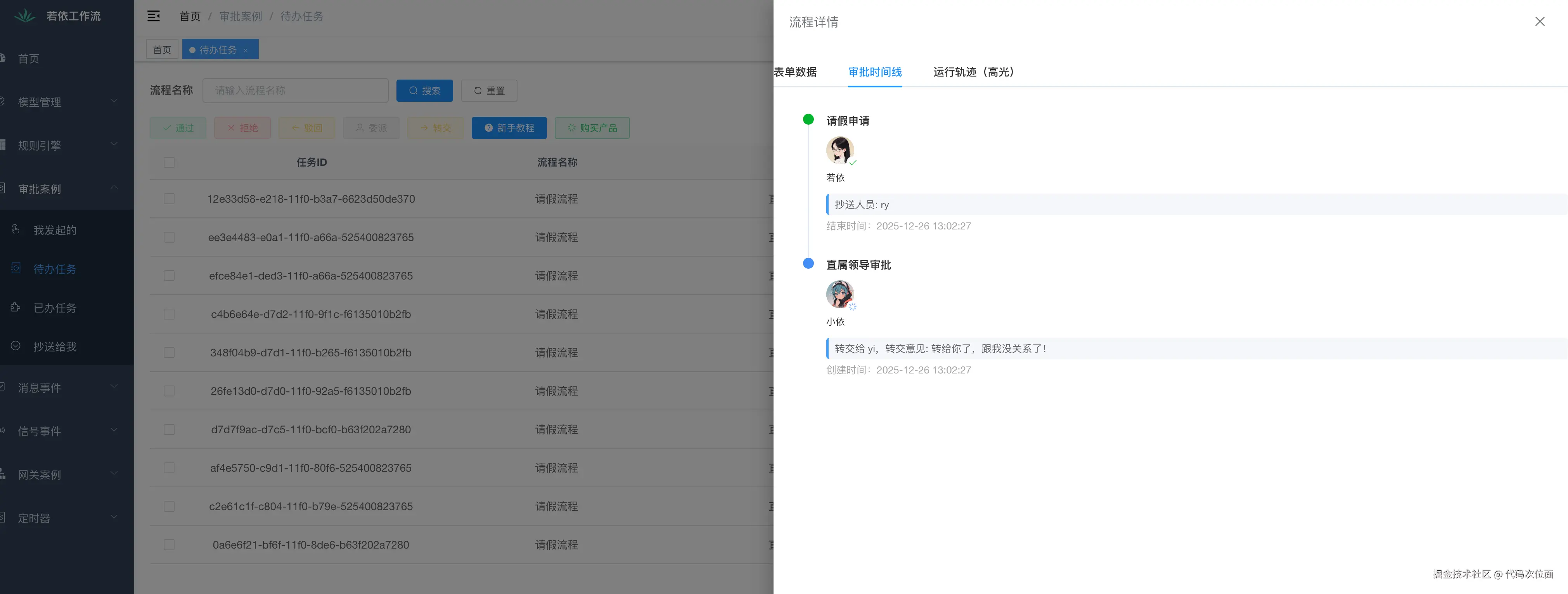 在审批流中,转交(也称转审或转办)是指当前审批人将本应自己处理的任务,直接转移给另一人处理,并且此后该任务将完全由接手人负责,不再返回给原审批人。 若依工作流