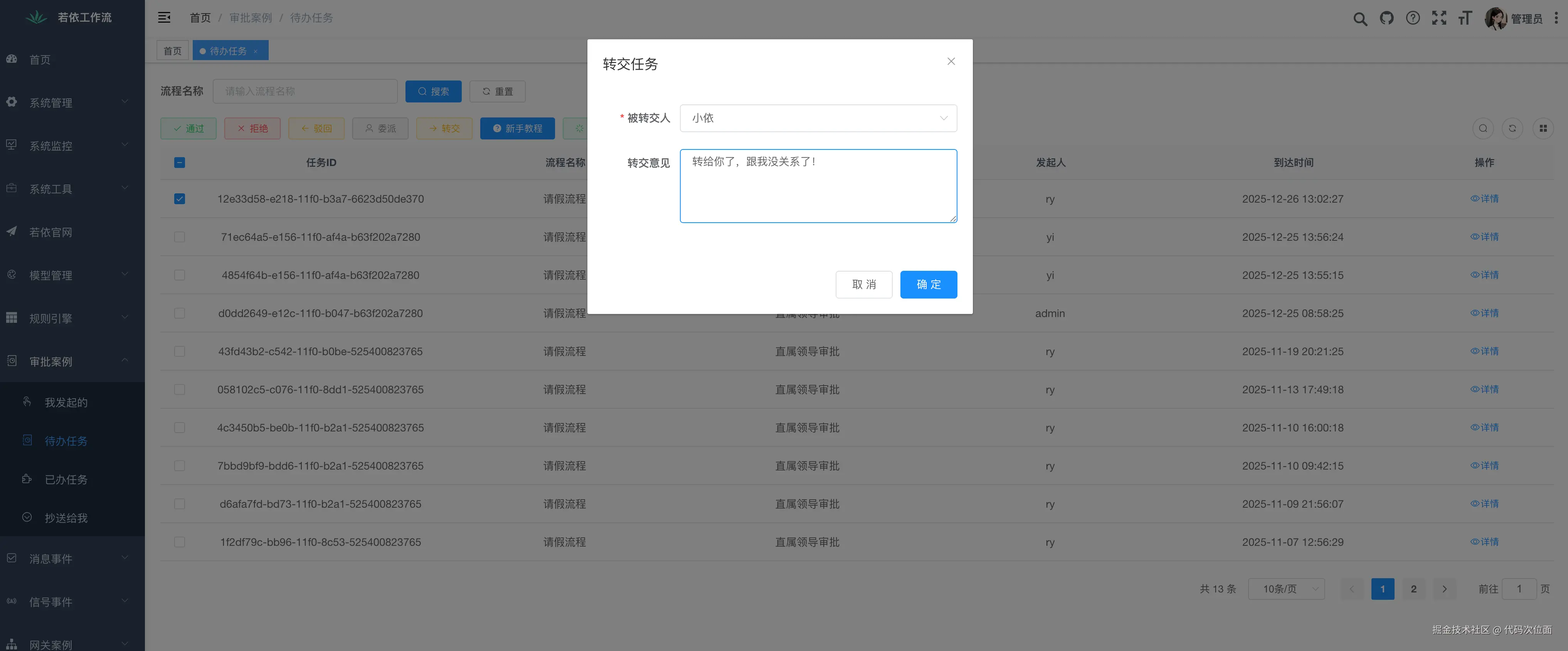 使用管理员(admin)账号登陆系统,在待办任务,找到记录并转交给,小依