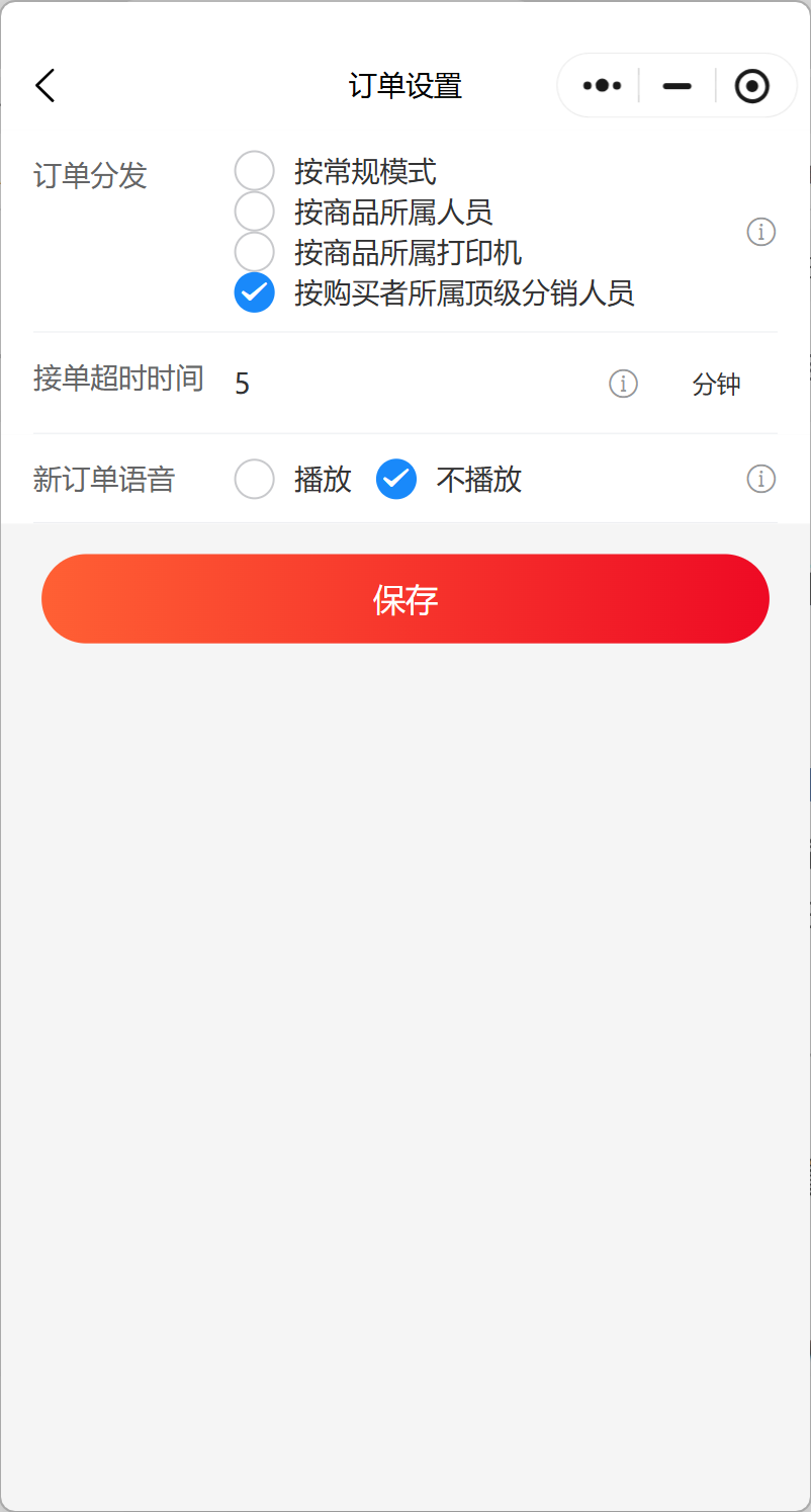 接单超时时间只在"按购买者所属顶级分销人员"模式下生效。如果订单分发模式设置为"常规模式"、"按商品所属人员"或"按商品所属打印机",此功能不会触发。