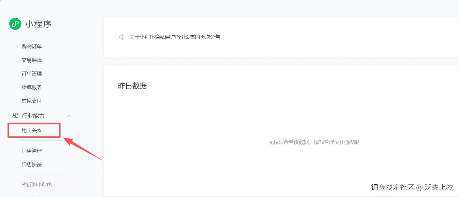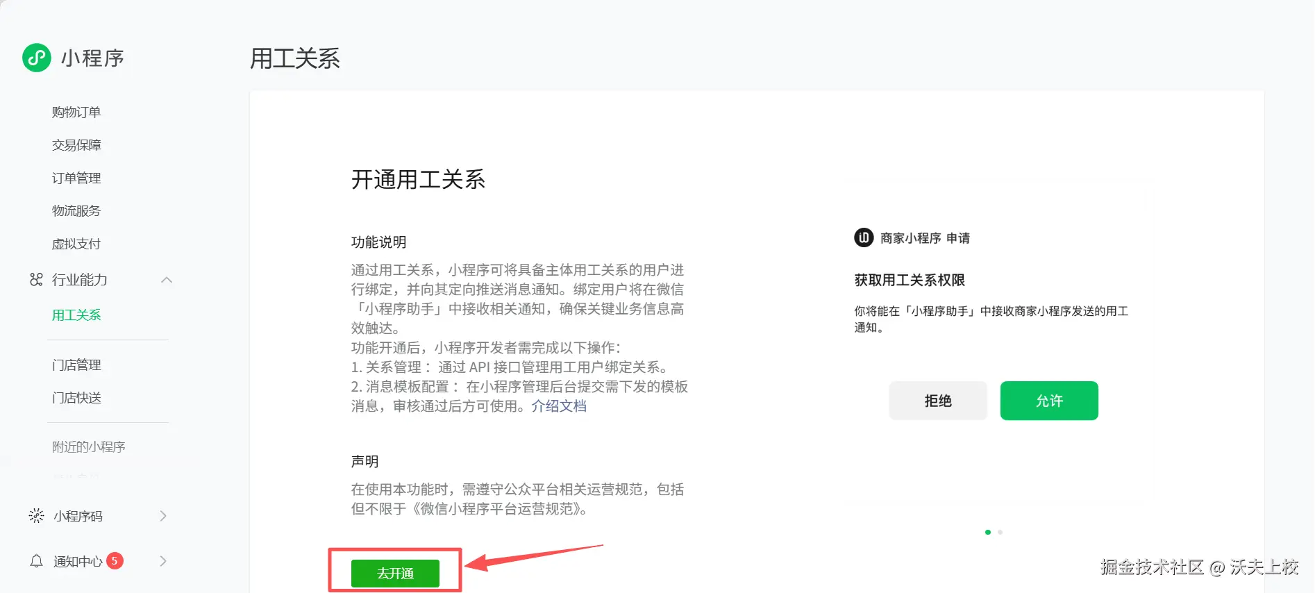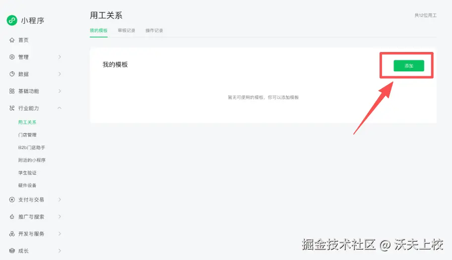 在添加支持的小程序类目,并且审核通过以后,可以在公众平台看到多了个行业能力 > 用工关系 菜单