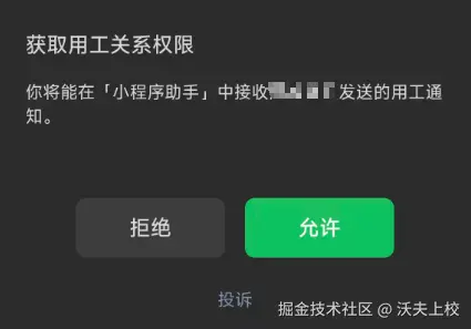 - 绑定用户将能在微信「小程序助手」中接收用工关系消息通知