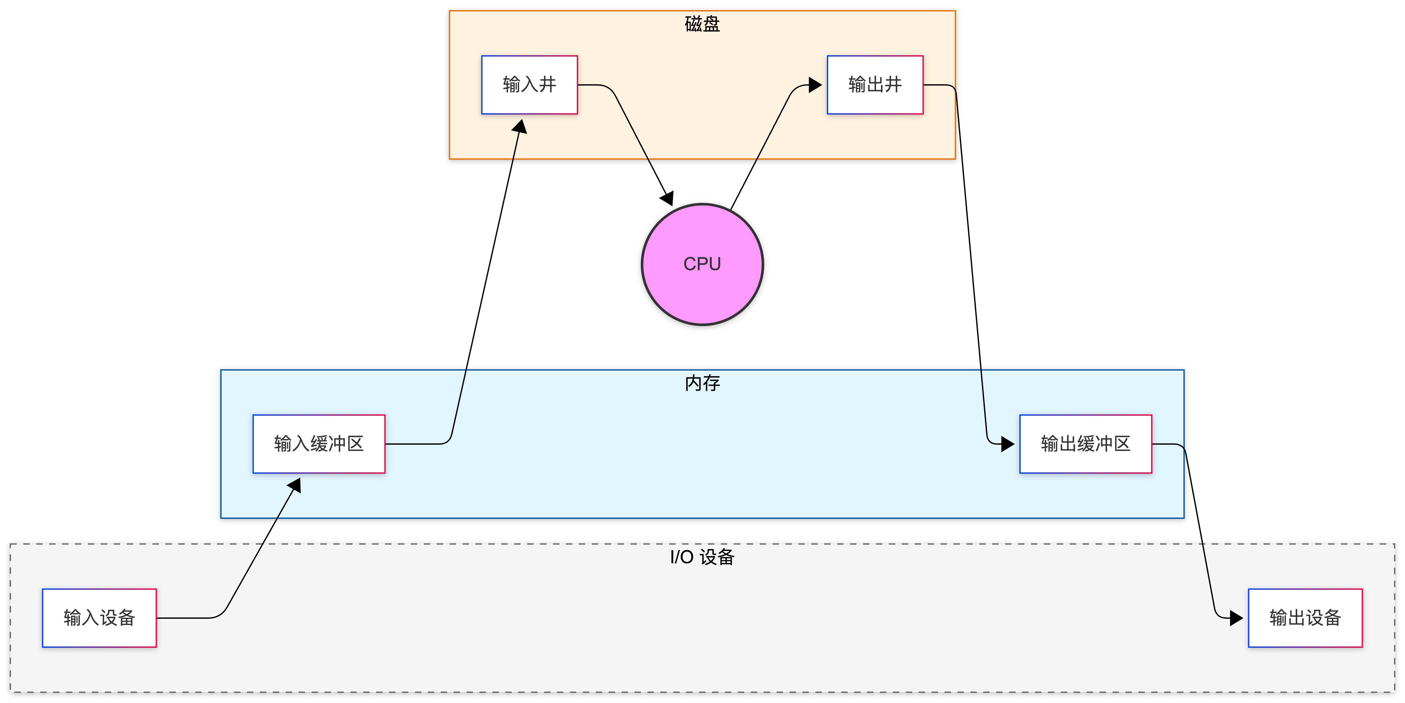 I/O 设备将数据传入输入缓冲区,当缓冲区满时,将缓冲区数据刷入输入井,方便 CPU 从输入井中读取数据