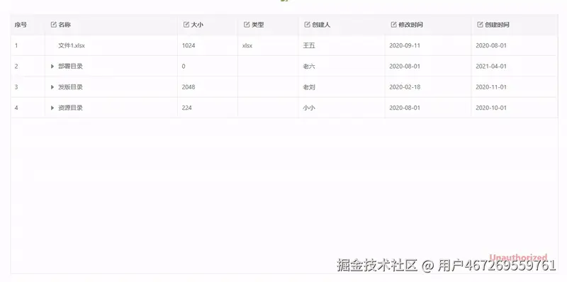 { id: 10000, parentId: null, name: '文件1.xlsx', type: 'xlsx', size: 3200, createBy: '王五', updateDate: '2020-09-11', createDate: '2020-08-01' },