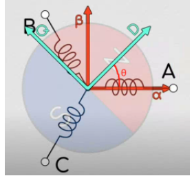 帕克变换的主要目的是将定子的a、b、c三相电流投影到随着转子旋转的直轴(d轴)、交轴(q轴)与垂直于dq平面的零轴(0轴)上,转子在电机控制过程中是不断旋转的,为了进一步描述转自和定子的位置关系(如下图),结合克拉克变换,把α-β轴投影·到D-Q轴上既可以得出