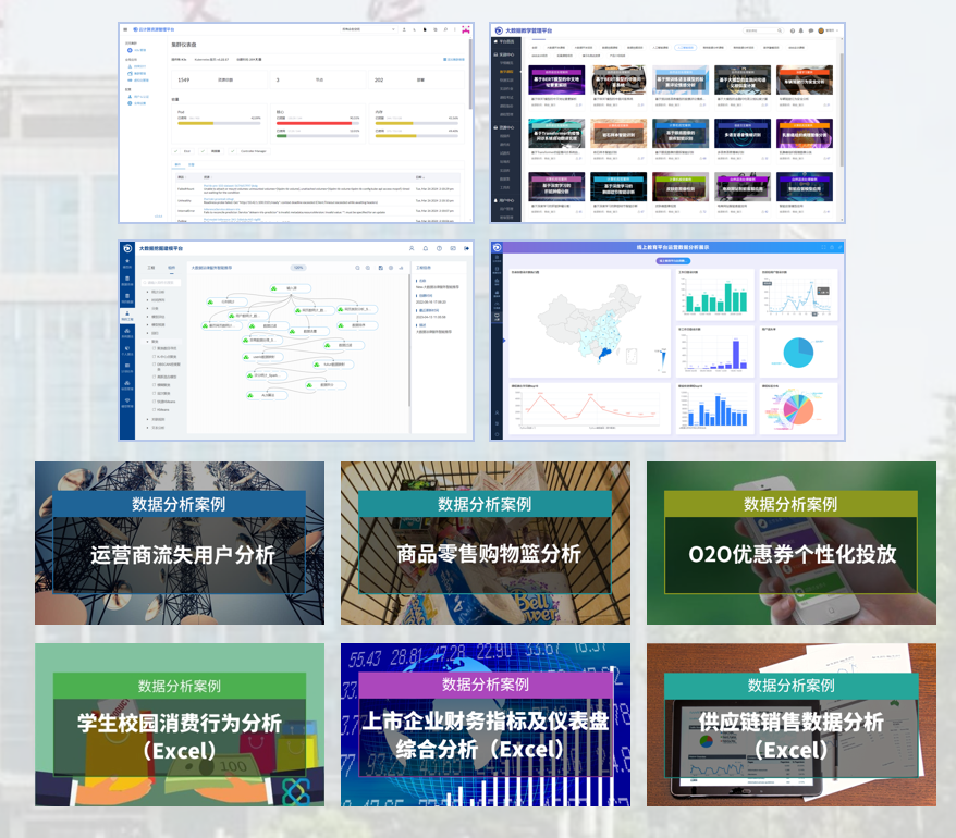 主要内容:大数据教学管理平台;Python编程实训平台;大数据挖掘建模平台;大数据分析可视化平台;大数据方向课程案例10余门