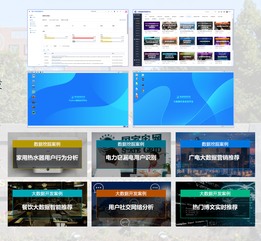 主要内容:云计算资源管理平台;大数据教学管理平台;Python编程实训平台;大数据开发实训平台;大数据方向课程案例10余门