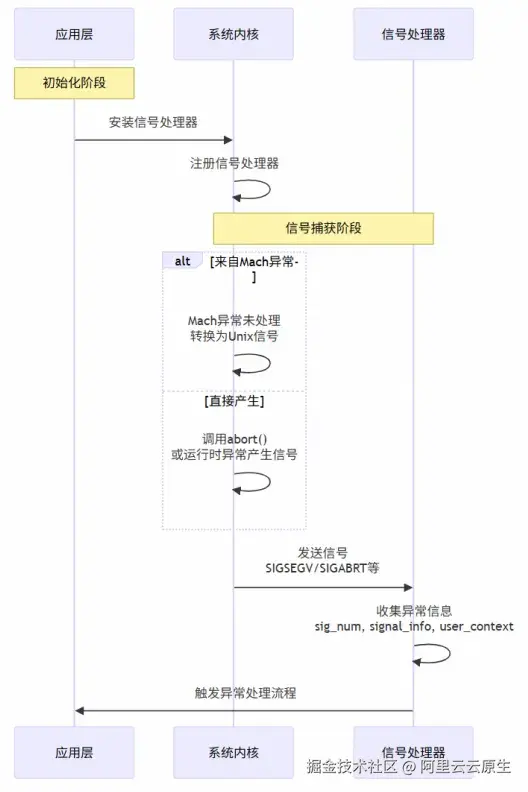 系统层异常包括 Mach 异常和 Unix 信号,是应用层异常监控的主要捕获点。我们需要同时捕获这两种异常,确保不遗漏任何底层异常。
