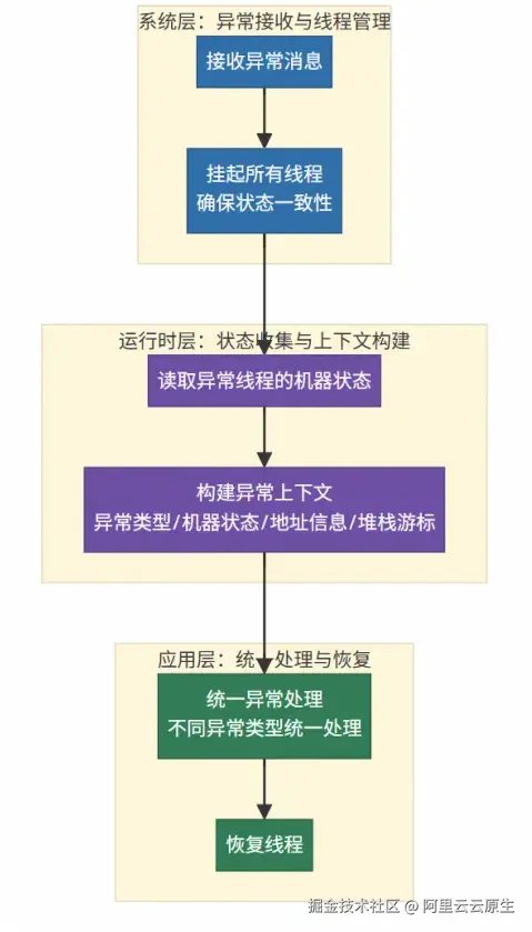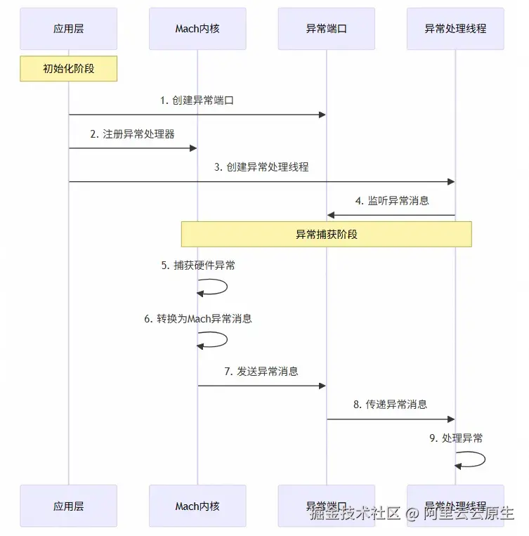 - 硬件异常 → Mach 异常: CPU 异常被 Mach 内核捕获,转换为 Mach 异常消息