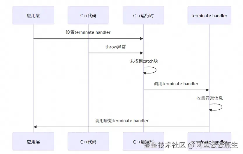 通过设置 C++ terminate handler 可以捕获未处理的 C 异常。当 C 异常未被捕获时,C++ 运行时会调用 std::terminate(),我们通过拦截这个调用来捕获异常。