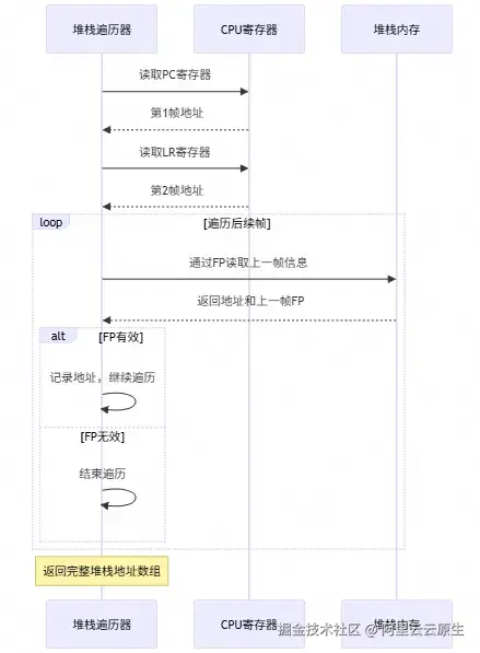- 第 3 帧及以后:通过帧指针链从堆栈内存中读取